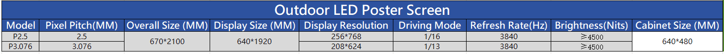 Led Poster Screen is digital display devices designed specifically for outdoor advertising, offering the following features and specifications: